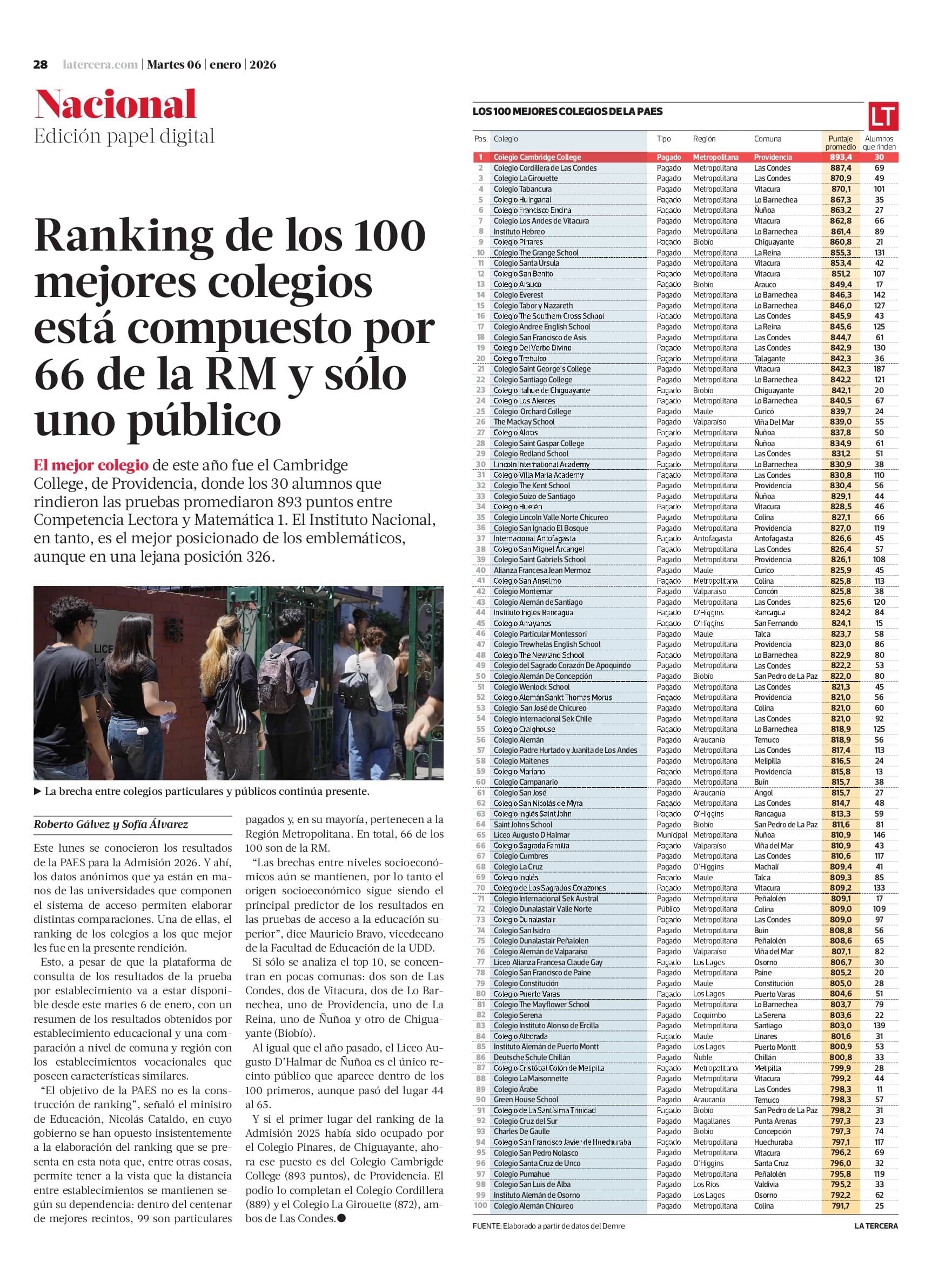 Este lunes se conocieron los resultados de la PAES para la Admisión 2026. Y ahí, los datos anónimos que ya están en manos de las universidades que componen el sistema de acceso permiten elaborar distintas comparaciones. Una de ellas, el ranking de los colegios a los que mejor les fue en la presente rendición.