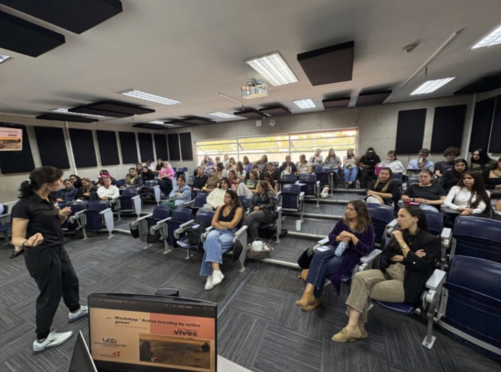 Como parte de su visita, el pasado 26 de marzo realizó un taller dirigido a estudiantes de Pedagogía de la Facultad de Educación UDD. En la instancia participaron alumnas de 4to y 5to año de Pedagogía en Educación Básica, de los cursos Curriculum Design and Lesson Planning y English Across the Curriculum, y estudiantes de 4to año de Pedagogía en Educación de Párvulos, del curso Estrategias de enseñanza al aire libre.